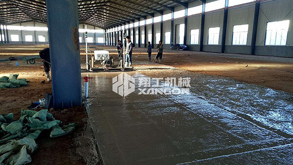在手扶混凝土攤鋪機整平頭有用的施工范圍內,首先人工將混凝土初平至比地坪標高高1-2㎝(具體高度依混凝土坍落度而定),然后用手扶混凝土攤鋪機一次性完成振搗、壓實、整平工作。