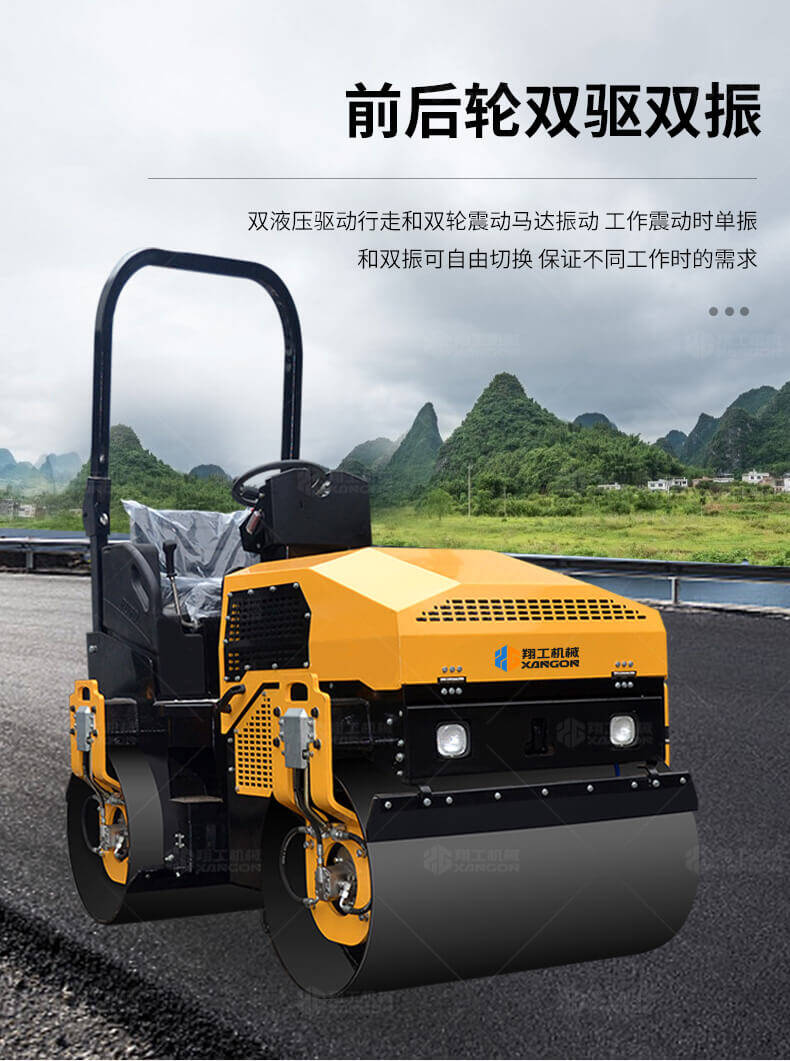 采用進口液壓系統,雙驅雙振,前后輪可單獨調節振動,亦可同時振動。液壓轉向,液壓驅動,液壓行走,液壓振動。進口英國鉑金斯柴油機三缸水冷四沖程,動力強勁,性能穩定。超快速度一小時可達12千米,無極變速。壓土,碎石,壓瀝青,壓回填土效果超乎想象。