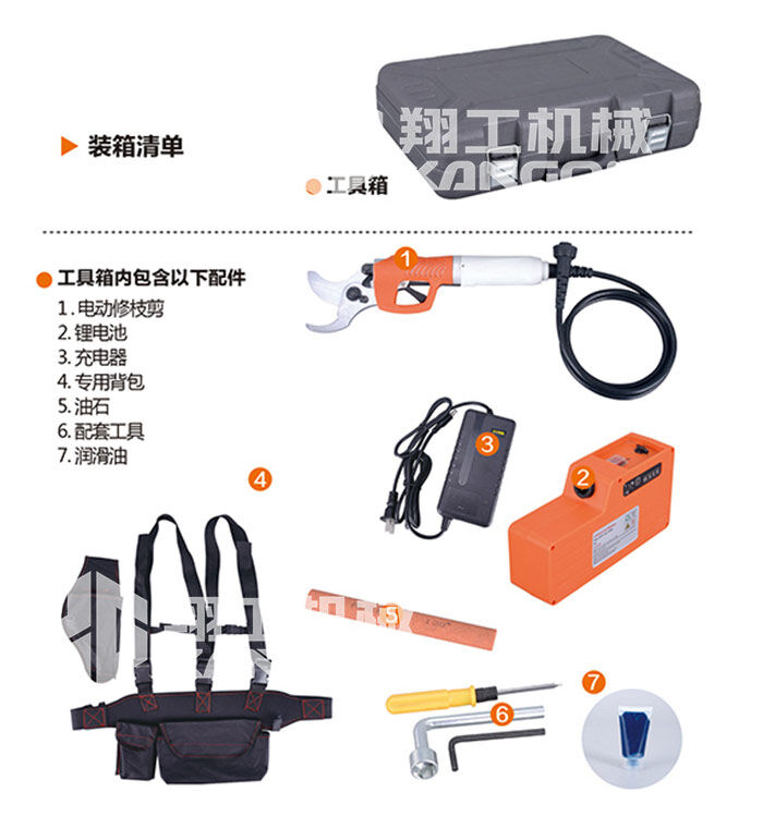 本產(chǎn)品為電池驅(qū)動電動修枝剪,由固定刀片、移動刀片、鋰電池、充電器、連接線、工作包、工具箱等部分組成,充電電壓為AC 110V~240V,主要應(yīng)用于30mm以下果枝嫁接的剪切和修剪及大批果園修剪、收摘等。使用時簡捷方便,是傳統(tǒng)手工剪枝效率的8-10倍,修枝質(zhì)量明顯高于傳統(tǒng)手工剪刀。