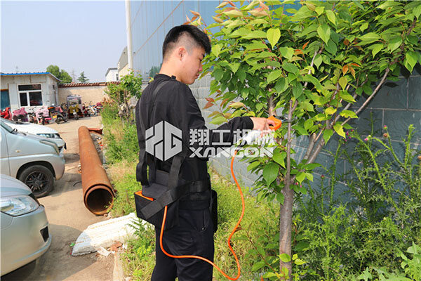 2.將電動修枝剪固定連接電源穿過背包并連接到電池,穿戴好背包(把剪刀電源線穿入背帶的指定固定扣,防止使用時剪到電線)