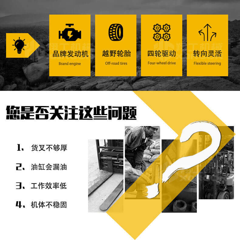 5.越野叉車(chē)發(fā)動(dòng)機(jī)功率大,采用全輪驅(qū)動(dòng)和越野輪胎。