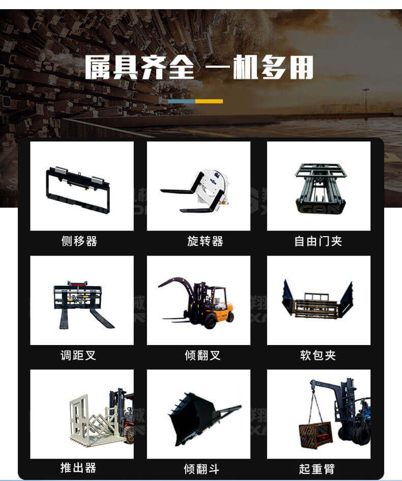越野叉車可以在坡地和不平地面上進行貨物裝、卸、堆垛及搬運作業,具有良好的機動性、越野性可靠性。其功能多樣,可搭配側移器、調距叉、旋轉器、軟包夾、推出器、側翻叉、側翻斗、起重臂等工具完成不同的工作。