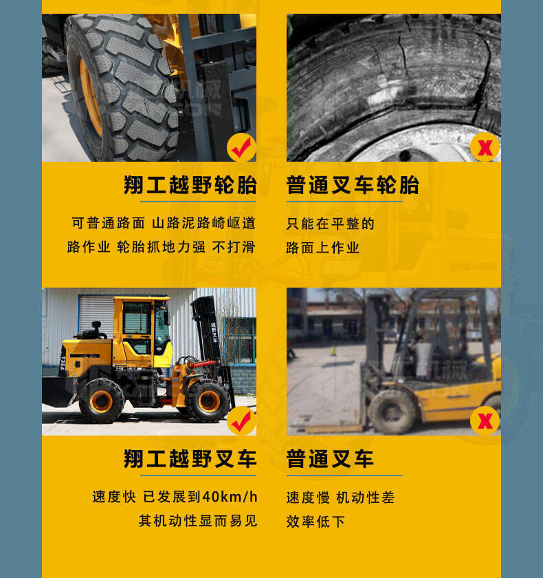3.普通叉車只能在平整的路面上作業,而越野叉車既可以在普通路面上作業,還可以在山路泥路崎嶇道路作業,輪胎抓地力強,不打滑。