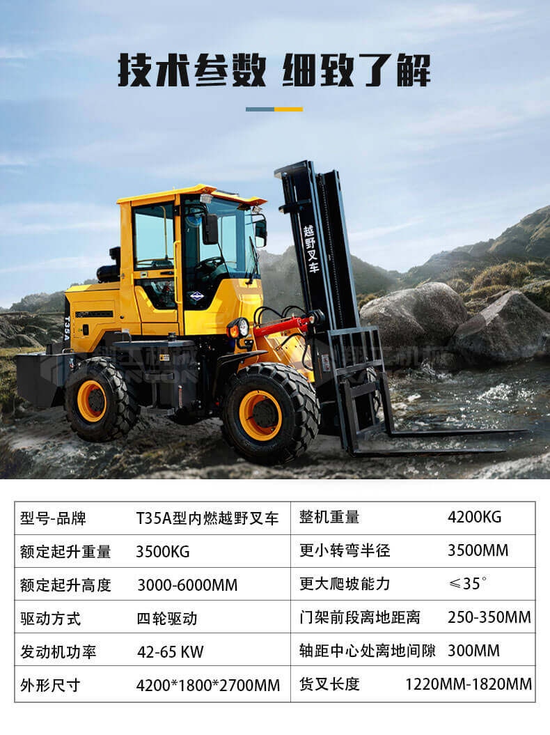 T35A型內燃越野叉車可以在坡地和不平地面上進行貨物裝、卸、堆垛及搬運作業,具有良好的機動性、越野性可靠性。其功能多樣,可搭配側移器、調距叉、旋轉器、軟包夾、推出器、側翻叉、側翻斗、起重臂等工具完成不同的工作。