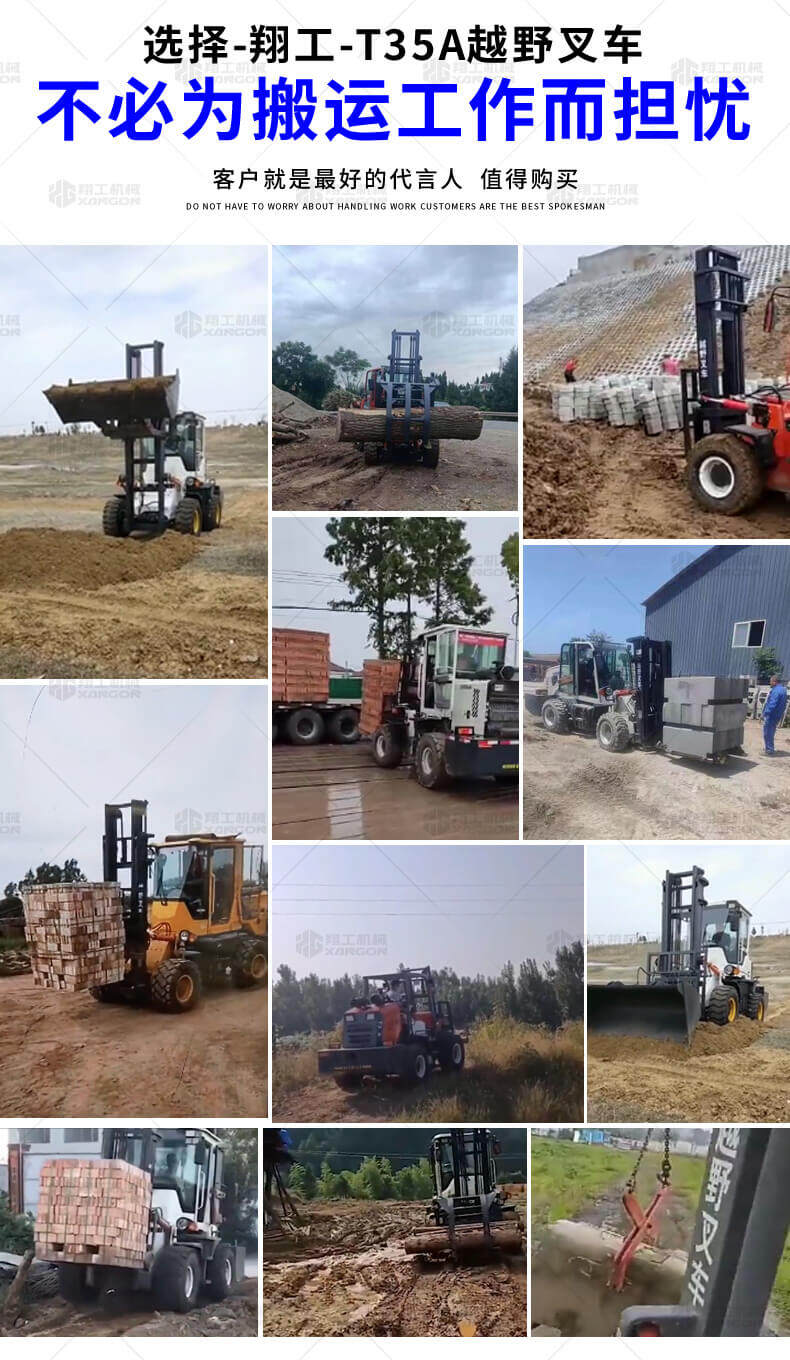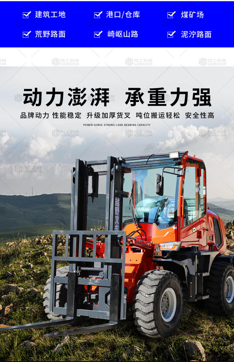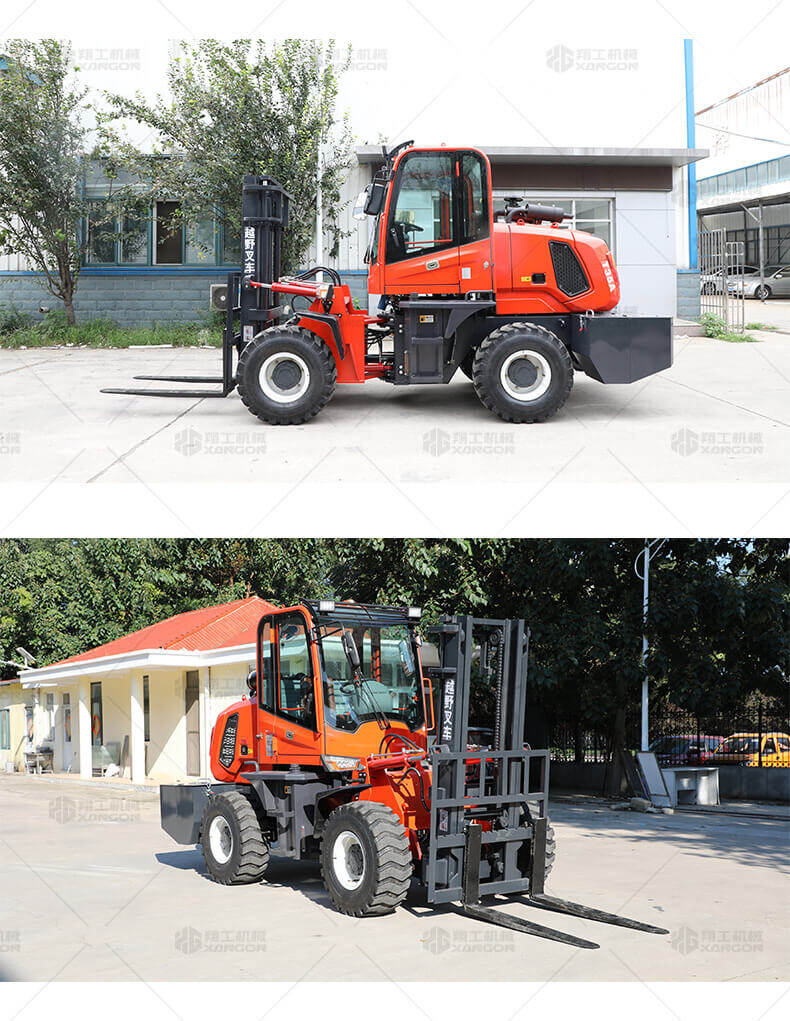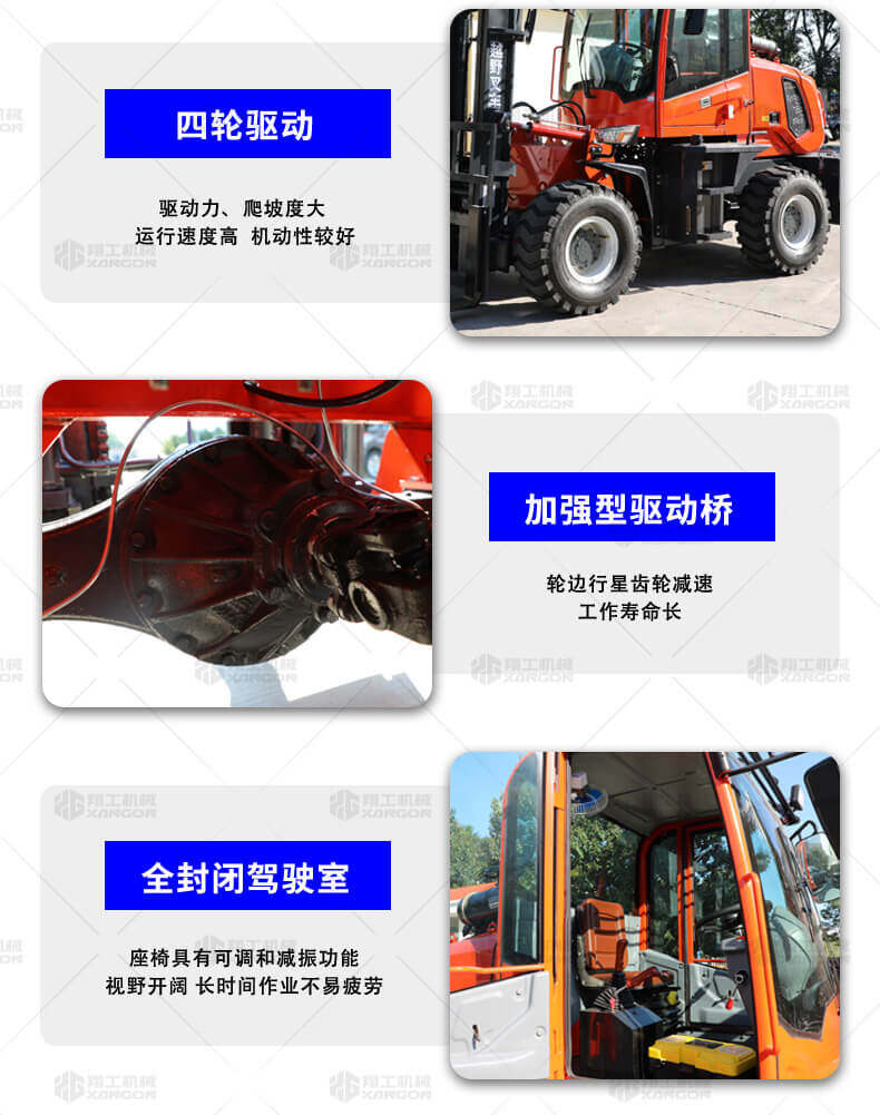 越野叉車(chē)可以在坡地和不平地面上進(jìn)行貨物裝、卸、堆垛及搬運(yùn)作業(yè),具有良好的機(jī)動(dòng)性、越野性可靠性。其功能多樣,可搭配側(cè)移器、調(diào)距叉、旋轉(zhuǎn)器、軟包夾、推出器、側(cè)翻叉、側(cè)翻斗、起重臂等工具完成不同的工作。
