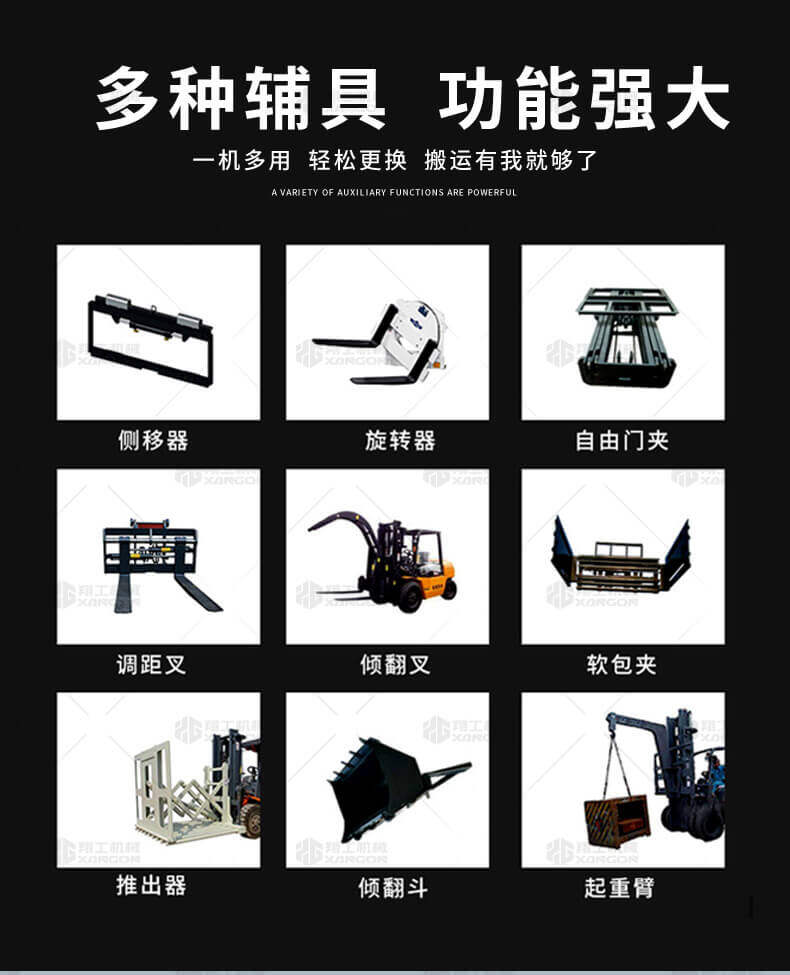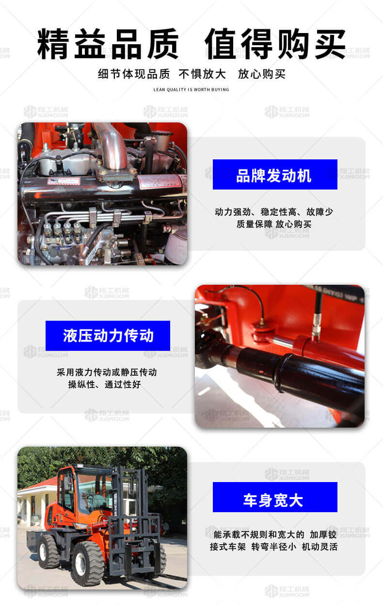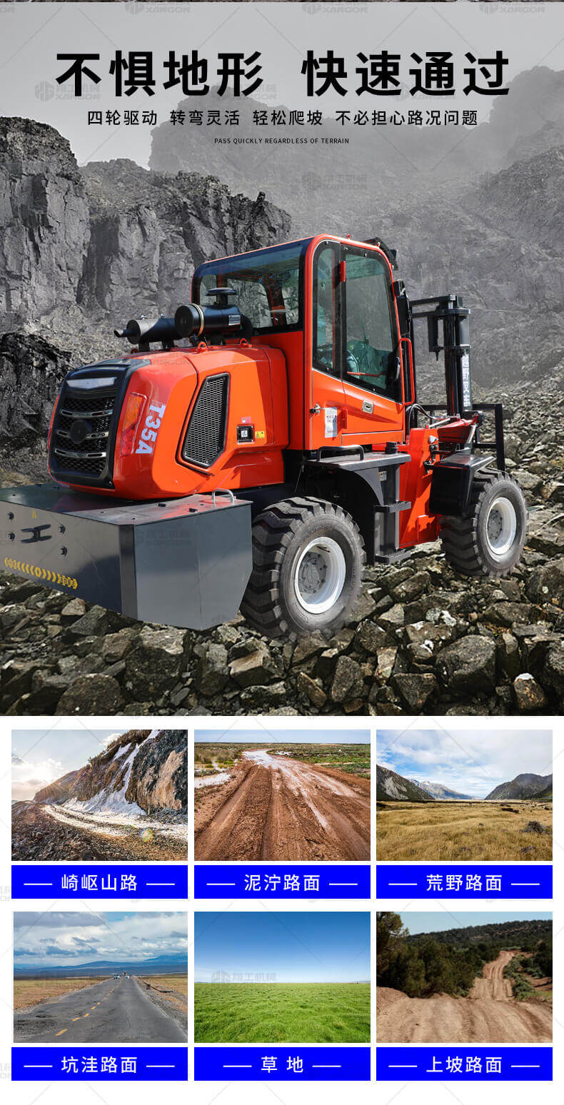 越野叉車(chē)可以在坡地和不平地面上進(jìn)行貨物裝、卸、堆垛及搬運(yùn)作業(yè),具有良好的機(jī)動(dòng)性、越野性可靠性。其功能多樣,可搭配側(cè)移器、調(diào)距叉、旋轉(zhuǎn)器、軟包夾、推出器、側(cè)翻叉、側(cè)翻斗、起重臂等工具完成不同的工作。